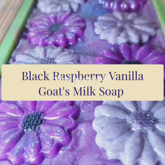 Black Raspberry Vanilla Goat's Milk Soap. A luscious blend of blackberries, raspberries, vanilla, and a hint of strawberries, coconut, lemon, and peach.